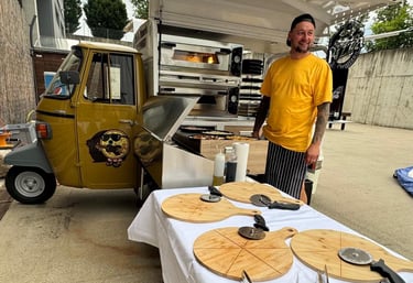 Aktuell sind wir auch bei Events aktiv und bringen unseren neuen APE (Baujahr 1981), der reaktiviert wurde. In diesem Fahrzeug sind 1-2 feste Backöfen integriert, sodass wir die Pizzen direkt am Veranstaltungsort backen können – egal ob bei Firmenfeiern, Festivals oder privaten Festen.
