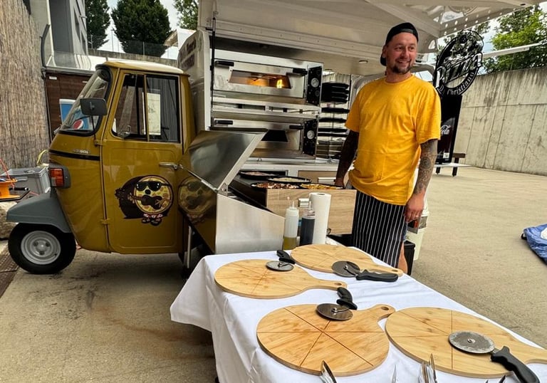 Wir bringen unsere leckeren Pizzen direkt zu Ihrem Event mit unserem motorisierten Fahrzeug.
